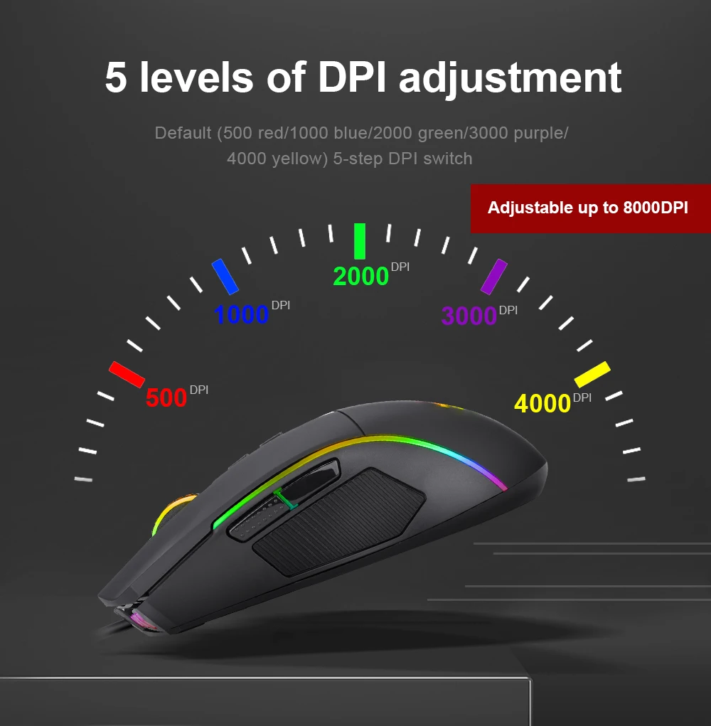WIRED USB GAMING MOUSE; built for PC Gamers - Ergonomic Redragon“Lonewolf ” RGB Backlit Gaming Mouse up to 8000DPI (Fast on the Fly User DPI switching 500/1000/2000/3000/4000) 35G acceleration. The High-Precision Sensor delivers Pinpoint Accuracy while the Gaming Grade Micro Switches have a rated Lifetime of 5 Million Clicks to ensure longevity, greater durability and extreme responsiveness, giving you an even greater edge over your competition