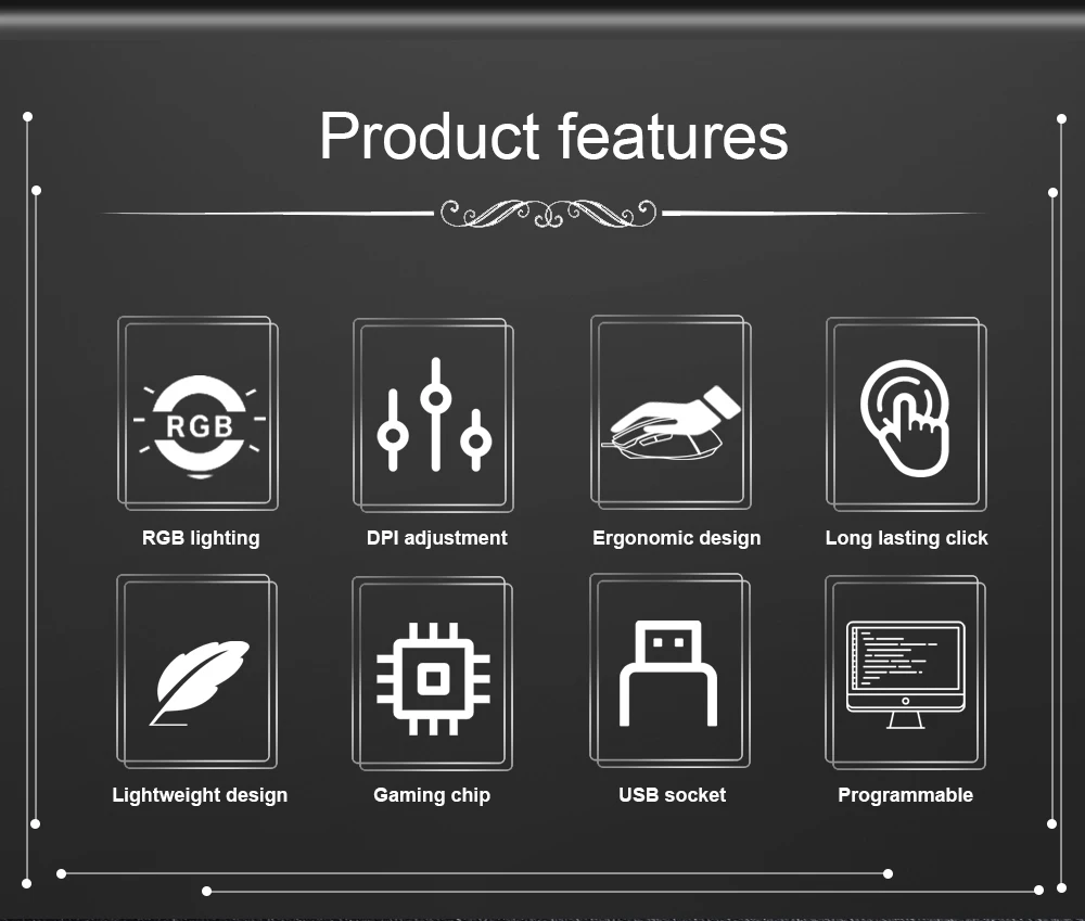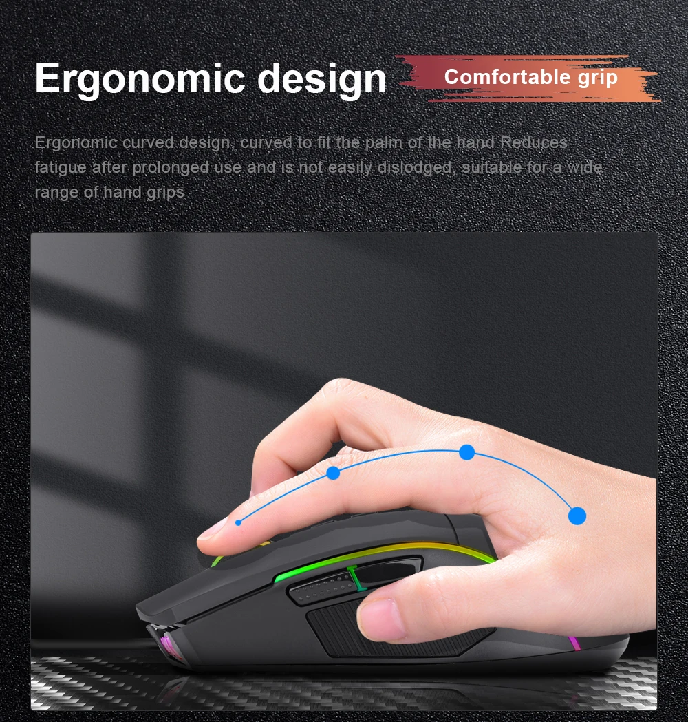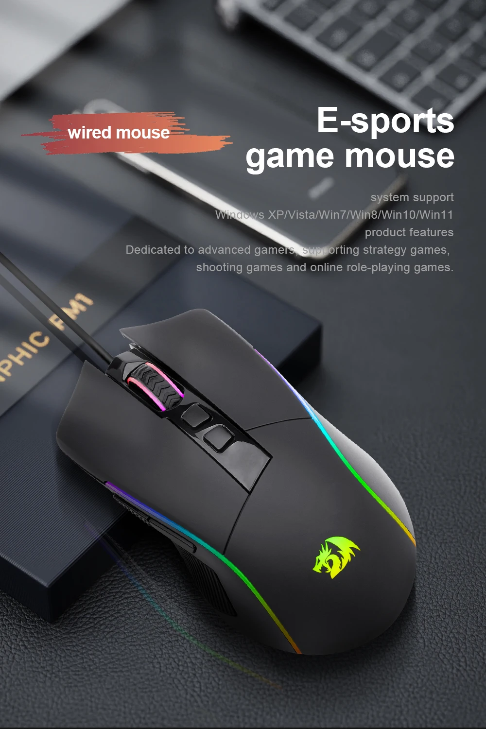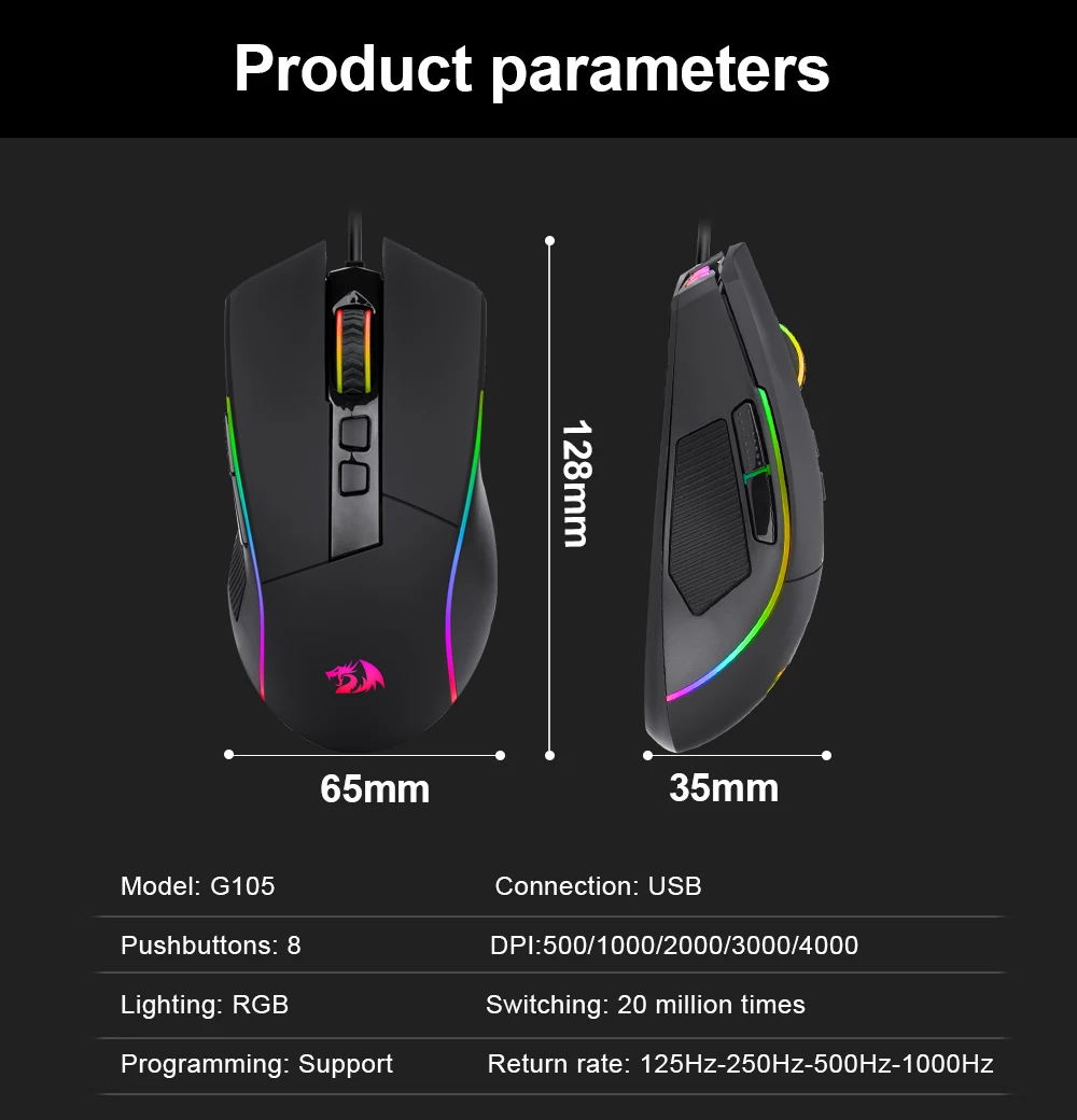 RGB BACKLIGHT MMO PROGRAMMABLE PC GAMING MOUSE; Total 8 Buttons of which 7 Buttons are user programmable. 5 Memory Profiles each with distinct LED color option for quick identification. The Mouse offers 16 million RGB LED color options, Rainbow Mode, Wave, Speed and Breathing Effects at 3 different Brightness levels. (Backlight can be disabled) The Redragon Gaming Mouse offers you total personalization