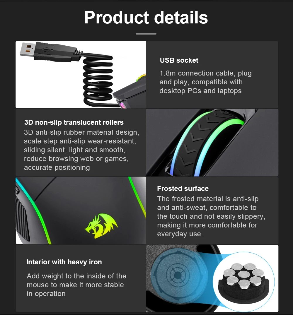 HIGH-END PC GAMING MOUSE FEATURES; The Redragon Mouse features; Textured Anti-Skid Scroll Wheel, Durable smooth TEFLON feet pads for ultimate gaming control. 7 programmable buttons. Total 8 buttons. The Mouse works great with Redragon Gaming Keyboards. 3mm strong high-speed braided fiber cable and a gold-plated corrosion free USB connector for a reliable connection